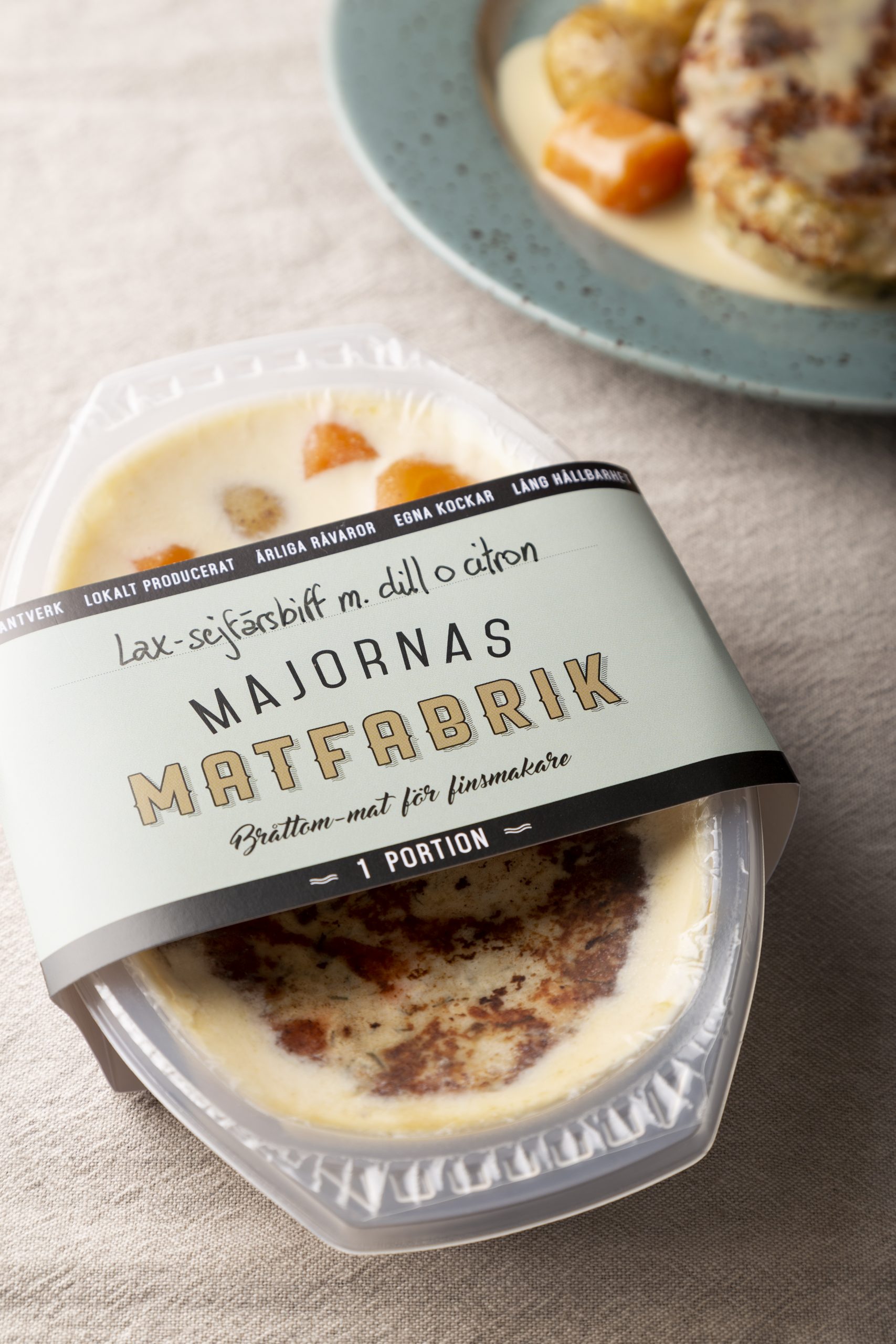 Ingredienser: fiskbiff 30% [sejfärs 75%(Sv.), laxfärs 25%, ÄGG, potatismjöl, salt, peppar, MJÖLK,dill, tabasco], potatis, citronsås 23% [GRÄDDE, SELLERI, chiliflakescitron, fiskspad, fänkål, lök, timjan, SMÖR, lagerblad, rapsolja, salt, peppar], socker, ättika, morot.